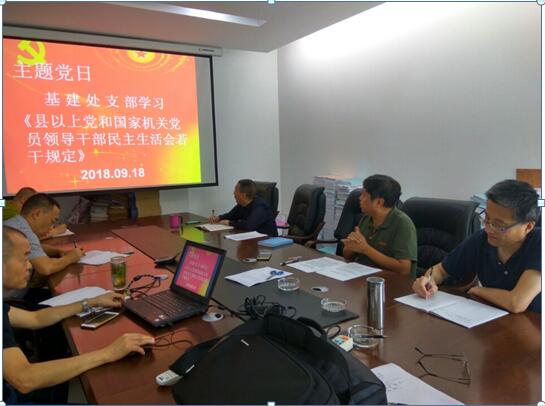 2018年9月18日,基建处支部召开主题党日,在支部书记吴永成同志带领下,集中学习《县以上党和国家机关党员领导干部民主生活若干规定》。